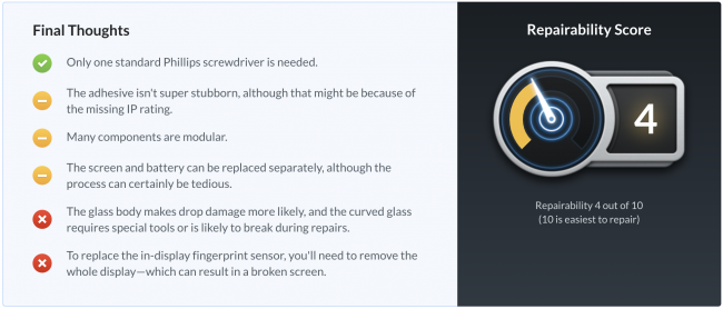 Итак, iFixit оценили ремонтопригодность аппарата в 4 балла из 10. Несмотря на то, что смартфон легко разбирается (для этого нужны лишь обычные отвёртки), заменить запчасти в нём не так просто. Во-первых, у смартфона модульная конструкция компонентов, которые при этом связаны между собой. То есть при замене одного, скорее всего, придётся менять и другой.