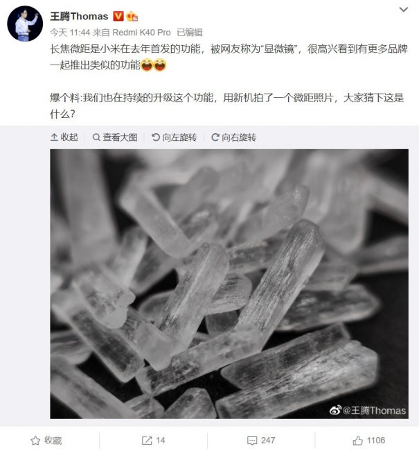 Более того, директор по новым продуктам Xiaomi Ван Тенг Томас (Wang Teng Thomas) опубликовал в соцсетях снимок, сделанный камерой этого смартфона. На нем с помощью макрообъектива можно рассмотреть вблизи кристаллы глутамата натрия.