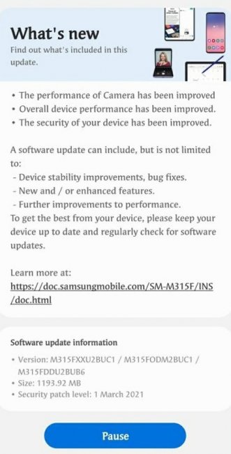 Как сообщает издание SamMobile, аппарат начал получать One UI 3.1. Прошивка имеет номер сборки M315FXXU2BUC1 и весит 1 ГБ. Её пока что выпустили для пользователей устройства в Индии. В других регионах обновление появится в ближайшие дни.