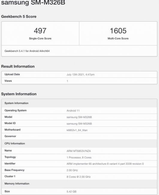Новинку заметили в базе данных теста производительности Geekbench. Аппарат проходит с номером модели SM-326B. Как сообщают сразу несколько источников, это Galaxy M32 с поддержкой 5G. В отчёте указано, что смартфон будет работать под управлением ОС Android 11. За его производительность должен отвечать процессор MediaTek Dimensity 720 в паре с 6 ГБ ОЗУ. Напомним, SoC построен по 7-нанометровому техпроцессу TSMC. Чип имеет два высокопроизводительных ядра ARM Cortex-A76 на 2 ГГц, графику Mali G57 и интегрированный 5G-модем.