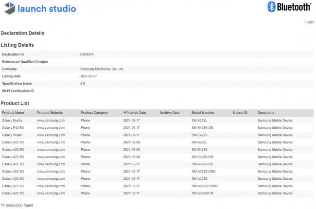 Речь идёт о смартфоне Galaxy F42 5G. Наши коллеги из SamMobile заметили аппарат в базе данных Bluetooth SIG. Гаджет упоминается в документе вместе с Galaxy A22 5G (SM-A226B), Galaxy Buddy (SM-A226L) и Galaxy Wide 5 (SM-E426S). Судя по всему, это один и тот же аппарат, но с разными названиями для разных рынков.