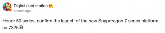 По словам китайского инсайдера Digital Chat Station из социальной сети Weibo, Honor 50 может стать первым смартфоном на рынке, который оснастят новым чипом Qualcomm 700-ой серии SM7325. Это кодовое название процессора Snapdragon 775G. SoC будет изготавливаться по 5-нанометровой технологии и получит вычислительные ядра Kryo 6xx, датчик Spectra 570 ISP, встроенный 5G-модем, а также поддержку Wi-Fi 6E и Bluetooth 5.2.