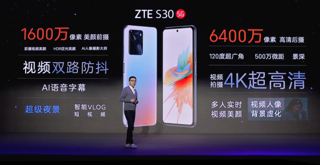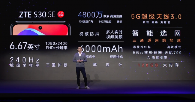 Средним смартфоном в линейке стал ZTE S30. Он оснащён таким же 6.67-дюймовым FHD+ AMOLED-экраном, но его частота составляет 90 Гц. Кроме этого, смартфон получил основную камеру с модулями на 64 МП + 8 МП + 2 МП + 2 МП, фронтальную на 16 МП, более простой 5G-чип MediaTek Dimensity 720 и аккумулятор на 4000 мАч.