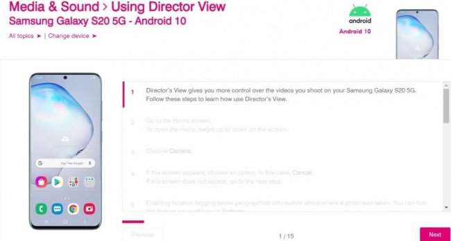 На появление Director View намекает страница поддержки программного обеспечения оператора T-Mobile USA. Здесь для Galaxy S20 5G добавлена инструкция по использованию Director View.