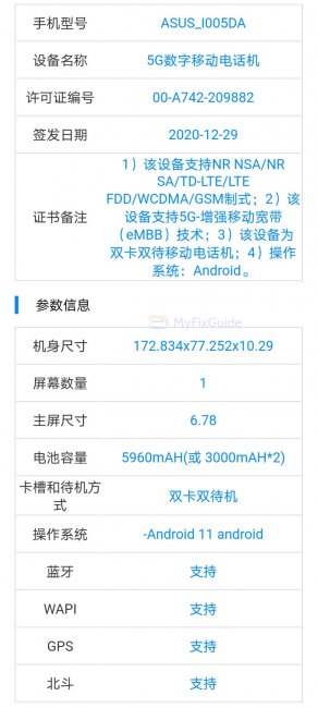 TENAA подтверждает аккумулятор емкостью 5960 мАч, поддержку 5G и ОС Android 11. Также отмечается, что батарея будет состоять из двух частей по 3000 мАч каждая.