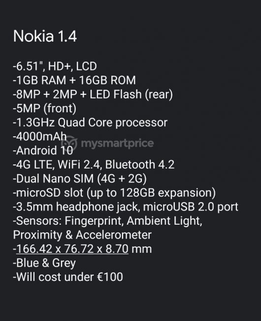 Наши коллеги из MySmartPrice раздобыли подробные спецификации Nokia 1.4. Аппарат получит 6.5-дюймовый LCD-дисплей с разрешением HD+. Также новинке приписывают восьмиядерный процессор с тактовой частотой 1.3 ГГц, 1 ГБ оперативной памяти, 16 ГБ встроенной (её можно будет расширить картой microSD), двойную камеру с модулями на 8 МП + 2 МП и Android 10 из коробки. Питаться гаджет должен от батареи на 4000 мАч. Ещё смартфон оснастят слотом для двух SIM, Bluetooth 4.2, Wi-Fi 2.4 ГГц, а также разъёмом для наушников и даже сканером отпечатков пальцев.