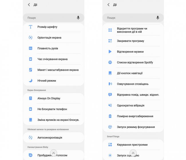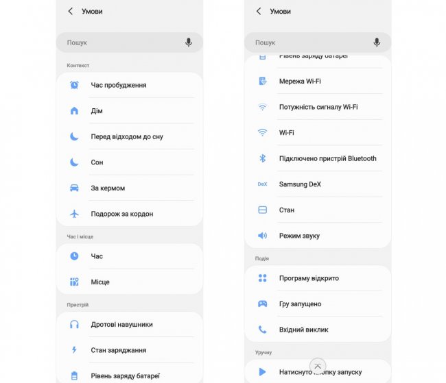 Для тех, кто совсем не знаком со сценариями Bixby в смартфонах Samsung, приведу список доступных настроек. Он состоит из двух частей: списка условий и списка действий при совпадении этих условий.