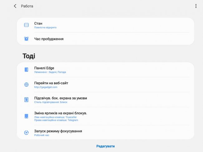 Начнем с пробуждения. После сна я беру в руки смартфон и раскрываю его. Поскольку в режиме самоизоляции не нужно ехать на работу (зато можно дольше поспать после ночных бдений в интернете), то можно считать, что я уже на работе. И, соответственно, готов принимать рабочие звонки и сообщения в Telegram. Соответственно, можно переключать режим фокусировки в рабочий (он отвечает за то, чтобы смартфон не отвлекал меня на задачи, не связанные с работой). Менять ярлыки на экране блокировки с Facebook и Clash of Clans на рабочие приложения — True caller и Telegram. Еще можно сразу открыть в браузере gagadget, чтоб увидеть что вышло на сайте пока я спал. А в панели Edge оставить только виджет погоды и список задач. Сразу напрашивается вопрос: причем тут сгибающийся дисплей? Вся магия в том, что сценарий запускается только после того, как я раскрою экран. То есть до этого я могу увидеть какие-то сообщения, быстро ответить на них, если они срочные, с внешнего экрана, либо проигнорировать и пойти умываться, чистить зубы и завтракать. А вот по-настоящему работать я начну, когда открою экран полностью.
