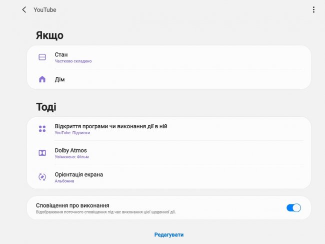 Еще один интересный сценарий: если я нахожусь дома и открываю экран в режиме Flex Mode, автоматически запускается YouTube, причем сразу показывает раздел подписок. Dolby Atmos переключает звук на схему работы «фильм», а ориентация экрана всегда становится альбомной. Конечно, мне не всегда дома нужен только YouTube, этот сценарий скорее приведен для примера.