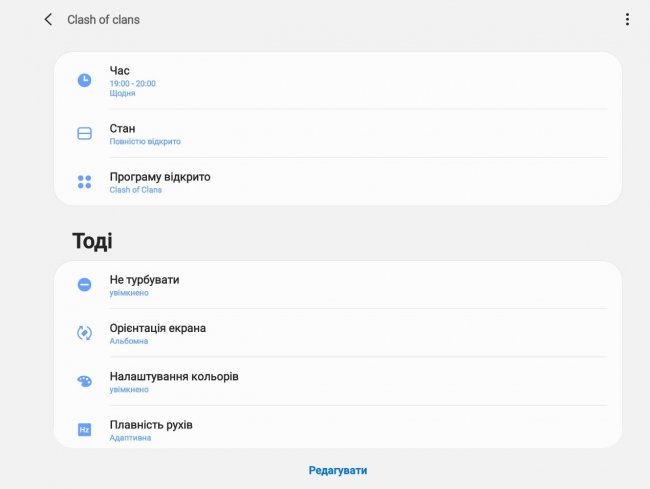 Напоследок, если я открываю смартфон после 19 часов (но не позже 20), то сразу запускается игра Clahs of Clans, дисплей переключается в режим адаптивной частоты развертки для плавности картинки, ориентация экрана становится альбомной, а яркость цветов насыщенной.