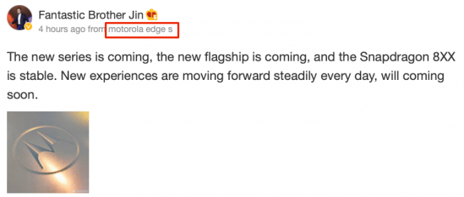 Генеральный директор Lenovo Чен Джин (Chen Jin) намекнул в социальной сети Weibo на скорый выход новинок. Пост был сделан со смартфона Motorola Edge S. Следовательно, именно так будет называться новая флагманская серия компании. Согласно Джину, топовая модель получит под капотом свежий SoC Qualcomm Snapdragon 888. Чип построен по 5-нанометровому техпроцессу и может похвастаться сверхмощным ядром Cortex-X1 с максимальной частотой 2.84 ГГц. Когда состоится анонс смартфонов Motorola Edge S, информации пока нет.