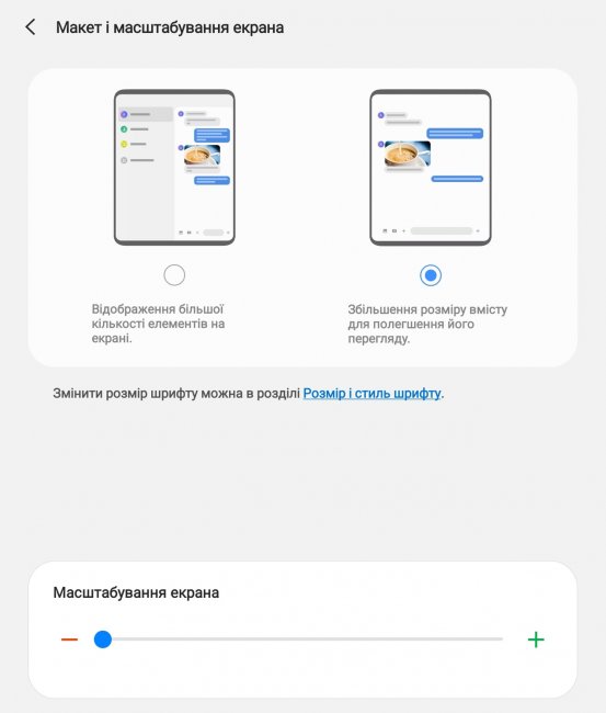 Чуть иначе, чем обычно, выглядит раздел с масштабированием экрана для тех, кому нужно улучшить видимость на экране, и увеличить шрифт. Можно выбрать один из двух вариантов макета приложения. В первом случае экран будет вести себя как планшет (если приложение это умеет), стараясь разместить больше информации на «планшетом» экране. Во втором случае экран ведет себя, как обычный дисплей смартфона и позволяет масштабировать картинку.