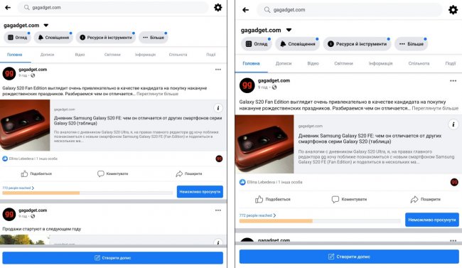 Разница между первым и вторым вариантом не сильно велика, я оставил режим по умолчанию, в котором на экране помещается больше информации. Например, для Facebook разница не велика, но заметна: