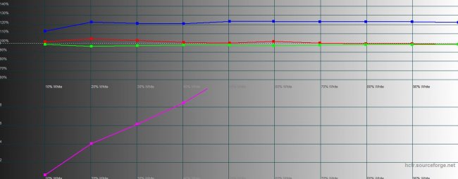 У основного дисплея ситуация, в общих чертах, повторяется. С той лишь разницей, что цветовой охват не дотягивает до цветового пространства sRGB в красном, но так же превышает его, как и внешний дисплей, в зеленом. Цветовая температура уже не так сильно скачет в темных тонах, а яркость синего превышает идеальный показатель за исключением темной части градиента, где она почти в норме.