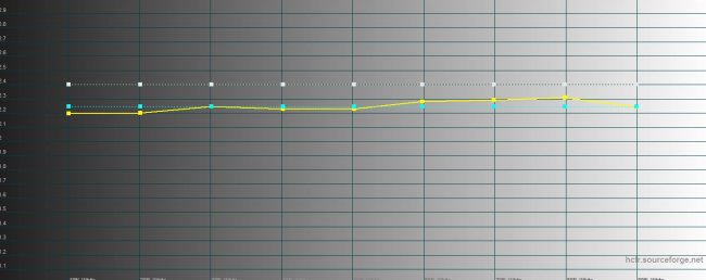 Наконец, последний тест показывает, что цветовой охват основного дисплея в режиме насыщенной цветности превышает цветовой охват sRGB (особенно в синей и зеленой части спектра), а цветовая температура показывает три разных уровня в темных, средних и светлых тонах градиента, то есть страдают светлые цвета изображения, отображающиеся чуть ярче, чем стоило бы. Зато уровень синего повышен не так сильно, как у внешнего дисплея.