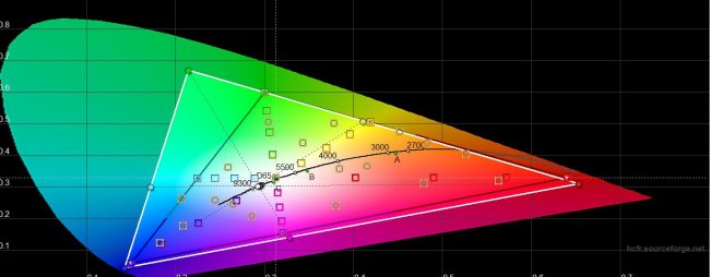 Цветовой охват экрана в этом режиме чуть превышает цветовое пространство sRGB в зеленом цвете, который выглядит ярче, чем хотелось бы. Цветоовая температура стабильно повышенная, но чуть проседает в темных тонах, то есть более светлые участки уходят сильнее в холодную часть спектра. График цветовых составляющих показывает повышенный синий цвет, характерный для всех OLED-экранов.