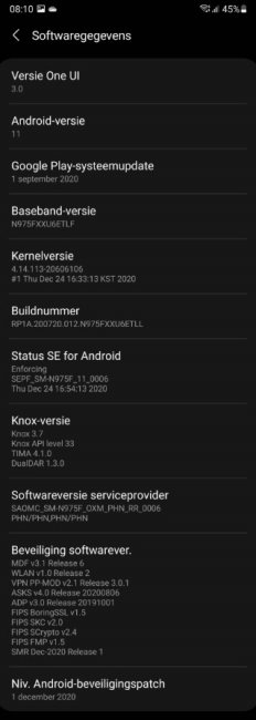 Система получила номер сборки N975FXXU6ETLL и включает в себя декабрьский патч безопасности, исправленные ошибки и фирменную оболочку One UI 3.0 с обновлённым интерфейсом, расширенными возможностями Always-On Display, а также новыми настройками и шторкой уведомлений.