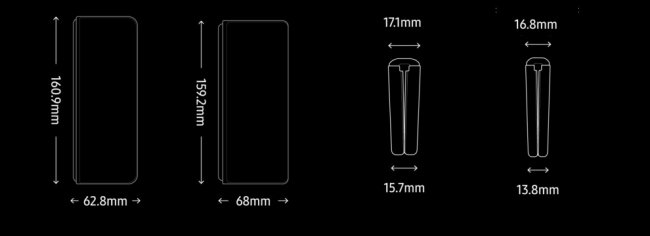 Интересно, что толщина нового смартфона (на рисунке он справа), пусть и ненамного, но уменьшилась (на незаметные 0.3 миллиметра у петли и на почти 2 миллиметра по краям). Высота стала на почти два миллиметра больше, а ширину уменьшили на 5 миллиметров. Благодаря этому удалось разместить оба дисплея с бОльшими диагоналями, чем у предшественника (попутно, изменив пропорции экранов и сделав их более вытянутыми и удобными в работе).