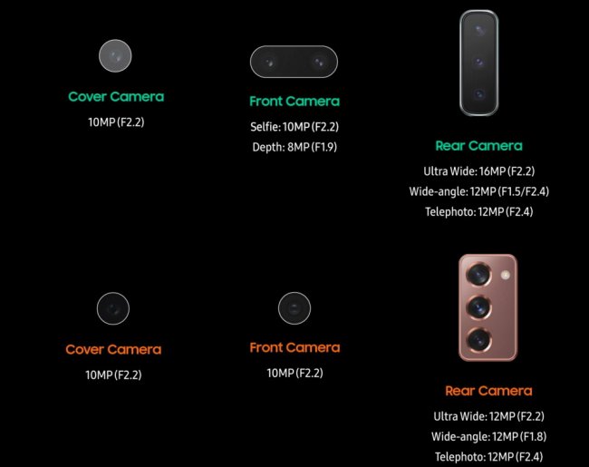 Изменения коснулись и системы из пяти камер (у первого Galaxy Fold их было 6). Фронтальная камера избавилась от модуля глубины, используемого для эффекта боке в селфи. С учетом возможностей, унаследованных Z Fold2 от Z Flip (использование внешнего экрана в качестве видоискателя) вторая фронтальная камера стремительно (прошел всего год) переходит в категорию рудиментов. Основной модуль камер с тремя объективами стал чуть больше выступать над корпусом (как у Galaxy S20 Ultra и Galaxy Note 20 Ultra) и получил светодиодную вспышку, полезность которой перешла из категории фотосъемки (флагманским смартфонам вспышка не нужна уже) в категорию еще одного (в длинном списке) устройства, уничтоженного современными телефонами — фонарика.