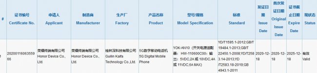Новинка имеет кодовое название YORK и обозначение модели YOK-AN10. Судя по данным сертификационного ведомства, устройство будет поддерживать быструю зарядку мощностью 66 Вт, как у флагманов Huawei Mate 40 Pro и Mate Pro+.