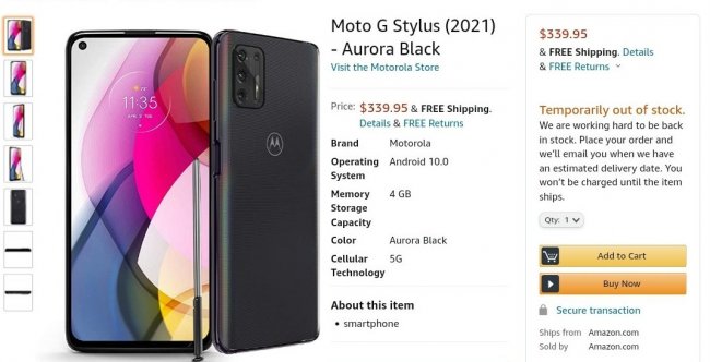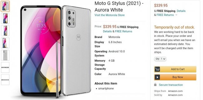 Недавно мы рассказывали, что компания Motorola работает над смартфоном Moto G Stylus 2021. Сейчас устройство «засветилось» на торговой площадке Amazon.