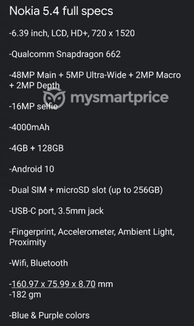Поставляться Nokia 5.4 будет с ОС Android 10 на борту. Также устройство получит порт USB-C, разъём для наушников, сканер отпечатков пальцев и основную камеру с четырьмя датчиками на 48 Мп + 5 Мп + 2 Мп + 2 Мп. Фронтальная камера в смартфоне будет 16-мегапиксельной. Аппарат выйдет на рынок в двух расцветках: синей и фиолетовой.