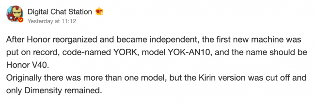 Согласно утечке, Honor V40 — это будет первый смартфон бренда после отделения от Huawei. Аппарат проходит с номером модели YOK-AN10 и кодовым названием YORK. Кстати, инсайдер подтвердил, что ждать чип Kirin в устройстве не стоит. Аппарат точно будет работать на процессоре MediaTek. Если верить предыдущим утечкам, речь идёт о SoC MediaTek Dimensity 1000+, хотя есть также вероятность, что смартфон оснастят новым 6-нанометровым процессором MT6893. Его должны выпустить в ближайшее время.