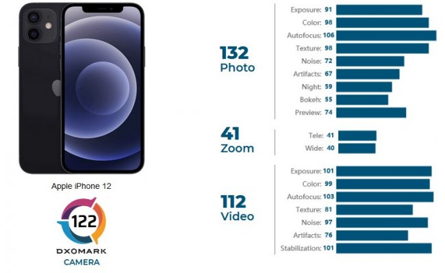 В результате iPhone 12 получил 122 балла: 132 за фото, 41 за зум и 112 за видео.