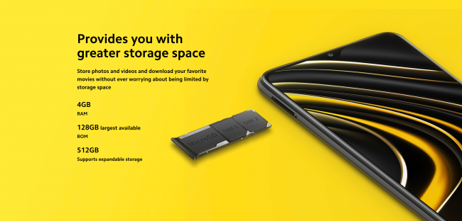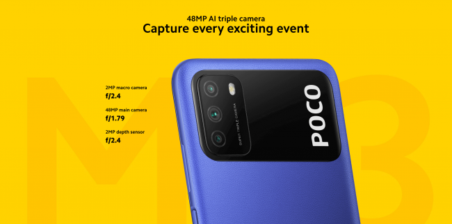 Новинка получила уникальный внешний вид с необычным дизайном камеры, пластиковый корпус с поверхностью «под кожу» и три расцветки: Power Black, Cool Blue и POCO Yellow. Под капотом устройства трудится 11-нанометровый процессор Qualcomm Snapdragon 662. Чип поставляется в паре с 4 ГБ ОЗУ и накопителем на 64 или 128 ГБ. Его можно расширить картой памяти. Кстати, слот в смартфоне не гибридный. То есть одновременно можно установить две SIM и microSD.