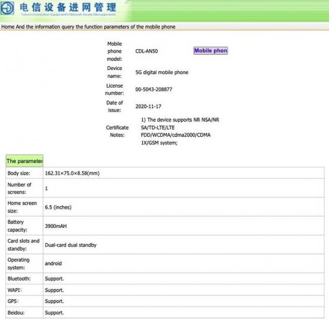 Также сертификацию прошла неизвестная модель CDL-AN50. Это 5G-смартфон с 6,5-дюймовым дисплеем, аккумулятором емкостью 3900 мАч и габаритами 162,3×75,0×8,6 мм. Это довольно много для телефона с диагональю 6,5 дюйма, а батарея мала для устройства таких размеров. Что это будет за модель — пока непонятно.