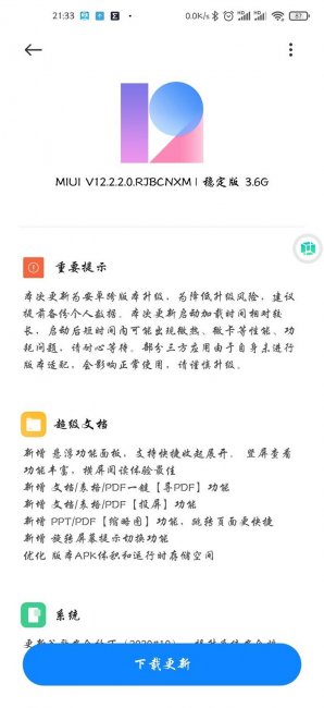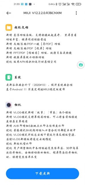 Обновление вышло с номером сборки MIUI V12.2.2.0.RJBCNXM и весит больше 3 ГБ. В прошивку установили ноябрьский патч безопасности и множество изменений. Например, добавили новые настройки кастомизации внешнего вида, пакет «Супер Документы», новый режим съёмки VLOG и функцию AI watermark. Кроме этого, разработчики оптимизировали все стандартные приложения. Теперь они занимают меньше памяти в системе. Также в ПО исправили мелкие ошибки и улучшили камеру смартфона.