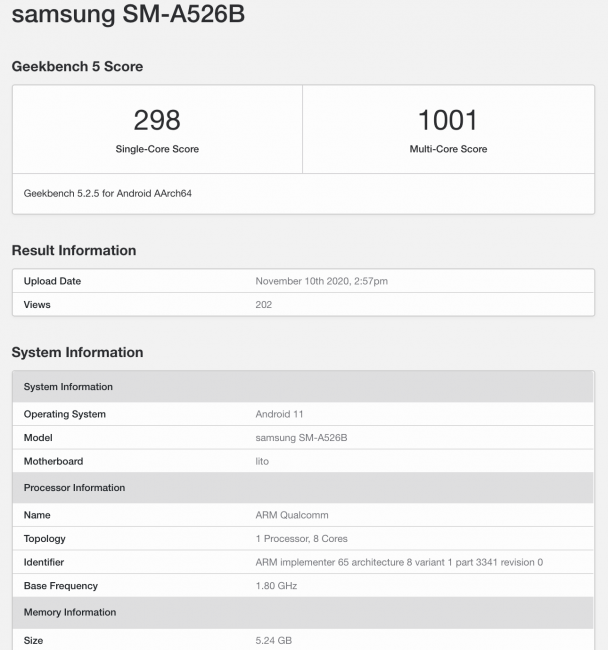 Наши коллеги из MySmartPrice заметили в базе данных теста производительности Geekbench новый смартфон корейского производителя с номером модели SM-A526B. Судя по всему, это Galaxy A52 5G.
