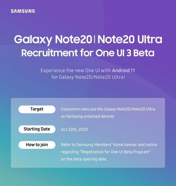 Прошивка получила номер N986NKSU1ZTJH. Протестировать её уже могут пользователи Galaxy Note 20 и Galaxy Note 20 Ultra в США, Германии и Южной Корее. Чуть позже программу бета-тестирования запустят в Индии, Польше, Великобритании и других странах. Когда запланирован релиз стабильной версии ПО — неизвестно. Скорее всего, обновление выпустят до конца этого года.