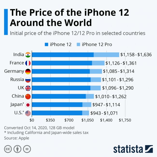 Сервис Statista выяснил, где самые дешевые и где самые дорогие устройства. Для оценки брали официальные цены на iPhone 12 иiPhone 12 Pro, оснащенные 128 ГБ памяти. Цены были переведены в доллары США соответственно курсу 14 октября 2020 года.