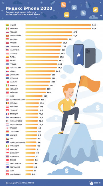 И в этом рейтинге опять лидирует Индия: местным жителям необходимо отработать почти 55 дней на iPhone 12 Pro. Ровно такой же показатель и в Мексике. Меньше всего надо трудиться в Швейцарии: 4,4 дня будет достаточно, чтобы оплатить покупку.