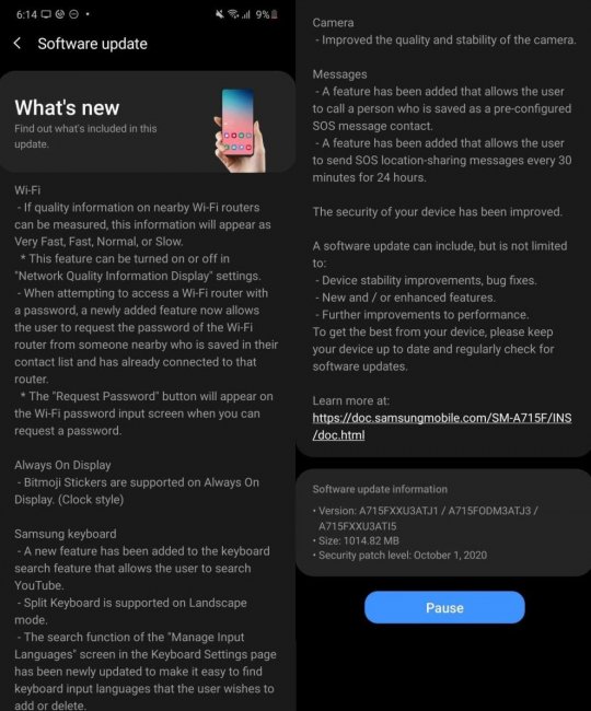 Прошивка вышла с номером сборки A715FXXU3ATI8 и весит 1 ГБ. В ней разработчики исправили ошибками, а также добавили новый патч безопасности за октябрь и множество полезных изменений. Например, улучшенное приложение камеры с новыми функциями, обновлённую клавиатуру Samsung Keyboard, поддержку стикеров Bitmoji в режиме Always On Display, поддержку навигационных жестов управления Android 10 в сторонних лаунчерах и многое другое.