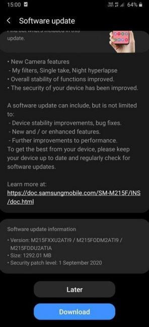 Система вышла с номером сборки M215FXXU2ATI9. Согласно официальному списку изменений, аппарат получит множество нововведений. Например, разработчики установили новые жесты навигации, улучшенную тёмную тему, обновлённую камеру, расширенную информацию о батареи, а также функции Quick Share, Music Share и многое другое. Кроме этого, в прошивке ещё поработали над ошибками и добавили сентябрьский патч безопасности.