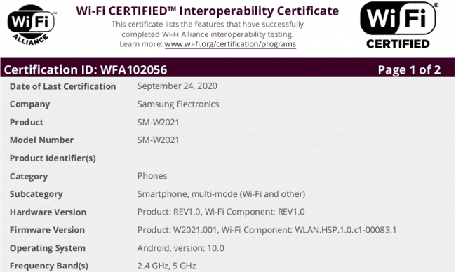 Информации о Samsung W21 5G пока немного: как и следует из названия, смартфон поддерживает 5G, работает под управлением ОС Android 10 и имеет двухдиапазонный Wi-Fi (2,4 ГГц и 5 ГГц). Кроме того, в списке указана версия прошивки W2021.001, возможность подключения к Wi-Fi 6 и функция Wi-Fi Direct.