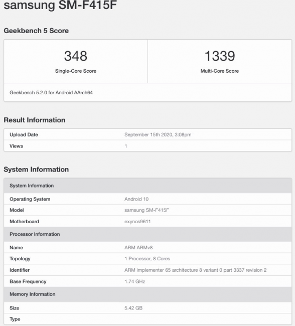 Спецификации новинки инсайдер не сообщил, но благодаря тесту Geekbench они также известны. Galaxy F41 будет работать на фирменном процессоре Exynos 9611. Кстати, он же установлен в смартфоне Galaxy M31. Ещё аппарат получит 6 ГБ оперативной памяти и предустановленную версию ОС Android 10.