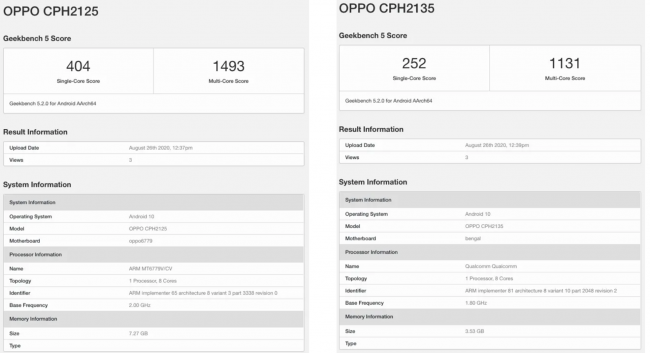 Второе устройство пока не получило имени, и появилось в «бенчмарке» под серийным номером CPH2135. По данным 91mobiles, устройство получит графический чип Adreno 610, так что может работать на SoC Snapdragon 662 или Snapdragon 460. Оперативной памяти, судя по данным бенчмарка, поставят 4 ГБ, а работать устройство будет на Android 10.
