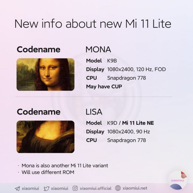Вторая модель Xiaomi Mi 11 Lite проходит под кодовым обозначением Mona. Её коммерческое название пока не уточняется. Смартфон тоже получит Snapdragon 778 и дисплей формата FHD+. При этом биометрический сенсор будет располагаться под дисплеем, о чём говорит аббревиатура FOD (Fingerprint on Display).