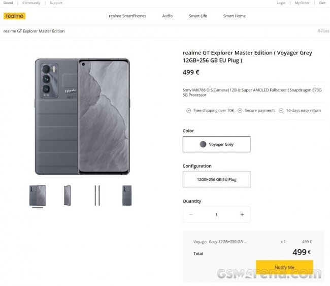 Итак, Realme GT Master Edition будет стоить 400 евро и будет доступен только в конфигурации 8/256 ГБ. За модель GT Master Explorer Edition просят 500 евро. За эту сумму вы получите версию с 12/256 ГБ памяти. Обе модели, похоже, будут только в серой расцветке Voyager Grey.