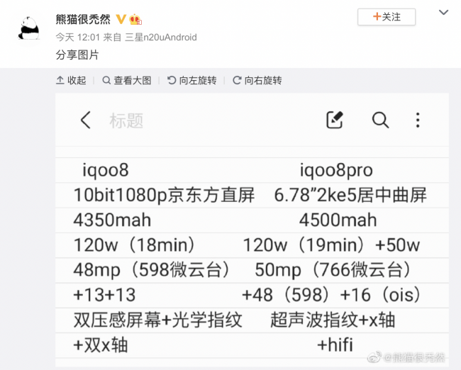 За неделю до презентации смартфонов iQOO 8 и iQOO 8 Pro инсайдер опубликовал в социальной сети Weibo подробные характеристики устройств.