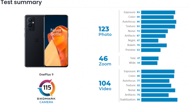Фотовозможности OnePlus 9 оценили в 123 балла. Отдельно нужно отметить 46 пунктов за зум, который у смартфона программный, и 44 пункта за работу камеры со сверхширокоугольной оптикой. За съёмку видео модель получила 104 балла.