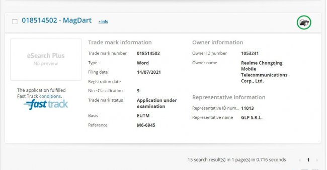 На это намекает недавняя заявка EUIPO (Ведомство интеллектуальной собственности Европейского союза). Realme подала ее, чтобы зарегистрировать торговую марку MagDart. Судя по названию, это аналог MagSafe от Apple, но продолжающий линию SuperDart — уже существующей системы подзарядки Realme.