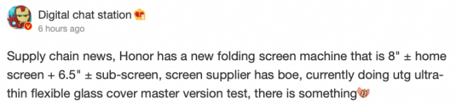 Согласно инсайдеру, поставками панелей для новинки Honor будет заниматься компания BOE. Она как раз сейчас тестирует технологию ультратонкого гибкого стекла (Ultra Thin Flexible Glass). Что касается начинки, то смартфону приписывают процессор Snapdragon 888 и до 12 ГБ ОЗУ. На рынок аппарат может выйти с названием Honor Magic Fold.