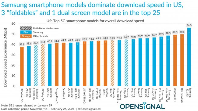 При этом в ТОПе так называемого рейтинга Opensignal только одни Android-модели. Первую строчку занимает Samsung Galaxy S21 5G с результатом 56,0 Мбит/с. В общем, устройства Samsung плотно заняли 15 мест из 25. Также в списке гаджеты OnePlus, LG, TCL, Motorola и Google. На последней строчке LG Velvet 5G с результатом 37,8 Мбит/с.