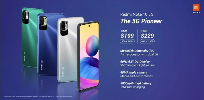 Redmi Note 10 5G появится на рынке в апреле. Аппарат будут продавать в четырех расцветках и двух модификациях памяти: