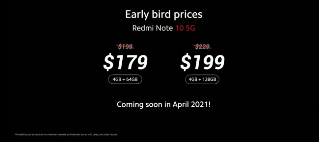 - Redmi Note 10 5G 4/64 ГБ — $199 (цена на старте продаж $179)