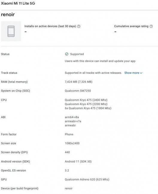Несмотря на то, что инсайдеры приписывали Xiaomi Mi 11 Lite процессор Qualcomm Snapdragon 775G, Google Play Console указывает на более старый чип — Snapdragon 765G.